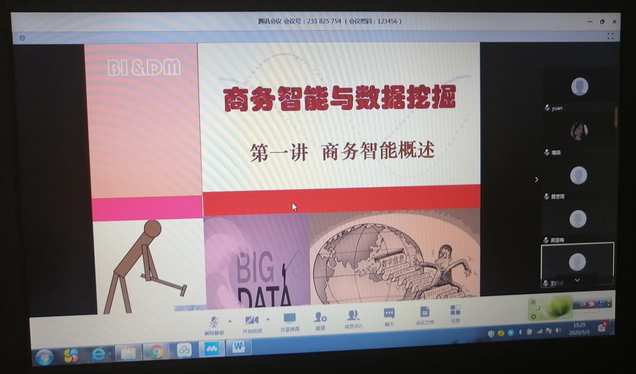 为响应“停课不停教、停课不停学”的号召,伟德国际1949信管系全体老师积极准备了相关课程的线上教学,3月3日(周二)下午2:00李阳旭老师准时为信管17级的同学们进行了一场精彩的《商务智能与数据挖掘》课程的线上授课。正式授课前,李老师进行了多种平台的选择、测试,初步确定腾讯会议和qq群课堂后,又通过论文指导、班级预上课等方式进行了测试,最后将腾讯会议作为首选,QQ群课堂备选,以确保上课的顺利进行。李老师选择的腾讯会议的在线教学模式,除了刚开始出现的声音短暂卡顿,整个教学过程平稳有序,学生全员出勤,老师授课声音清晰,PPT制作精美,屏幕分享直观简洁,语音问答互动氛围好,加上聊天窗口文字互动,学生反馈效果好。