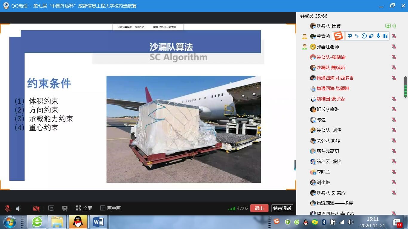 11月20日下午,物流管理与工程系举行了线上校内选拔赛答辩会。参赛队伍按照网上抽签顺序,利用QQ的屏幕分享功能,进行限时15分钟的PPT讲解,详细阐述了本队方案的整体构思与预计效果。9位评委老师对各答辩组的设计进行点评,指出各小组方案的不足和改进的思路。