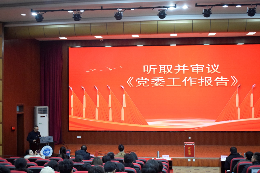 大会在庄严的国歌声中开幕。学院党委书记桑作银同志代表上一届党委作了题为《以新时代高标准高要求高质量党建助推开放的特色鲜明的高水平信息工程大学建设》的工作报告。报告全面回顾了过去五年伟德国际1949党的建设和其他各项事业发展所取得的成绩,深入分析了当前学院发展存在的问题和不足,提出了今后的工作目标、思路和措施。