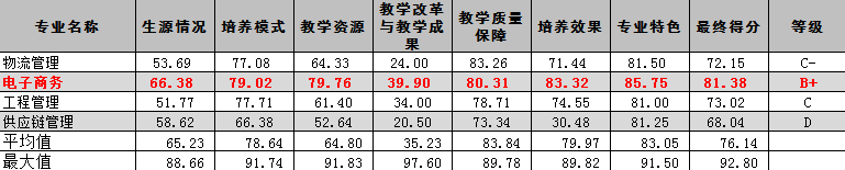 根据对一二三级指标雷达图的分析,电商专业的差距主要体现在:1.教师获得荣誉 -34;2.红黄牌警告 -29;3.教研论文 -18; 4.优质课程 -14;5.主编教材 -11;6.本科教学工程 -8;7.转专业 -6。专业需要在以上七方面加强建设。