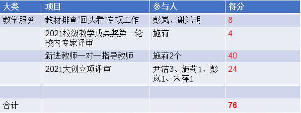 (2)朱萍、施莉、呙飒英、谢光明承担较多课时,硬指标完成了教学任务。