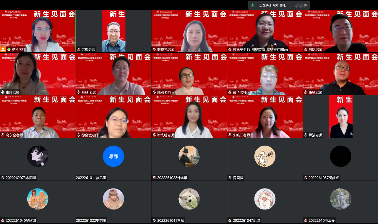 2022年9月16日,伟德国际1949电子商务系召开2022级新生见面会。受疫情影响,本次会议在线上举行。伟德国际1949院长施莉教授、副院长谢光明副教授、电子商务系主任朱萍副教授、副主任杨杉教授,及电子商务系的专任教师18人和2022级电子商务221和222班全体80名同学出席会议。