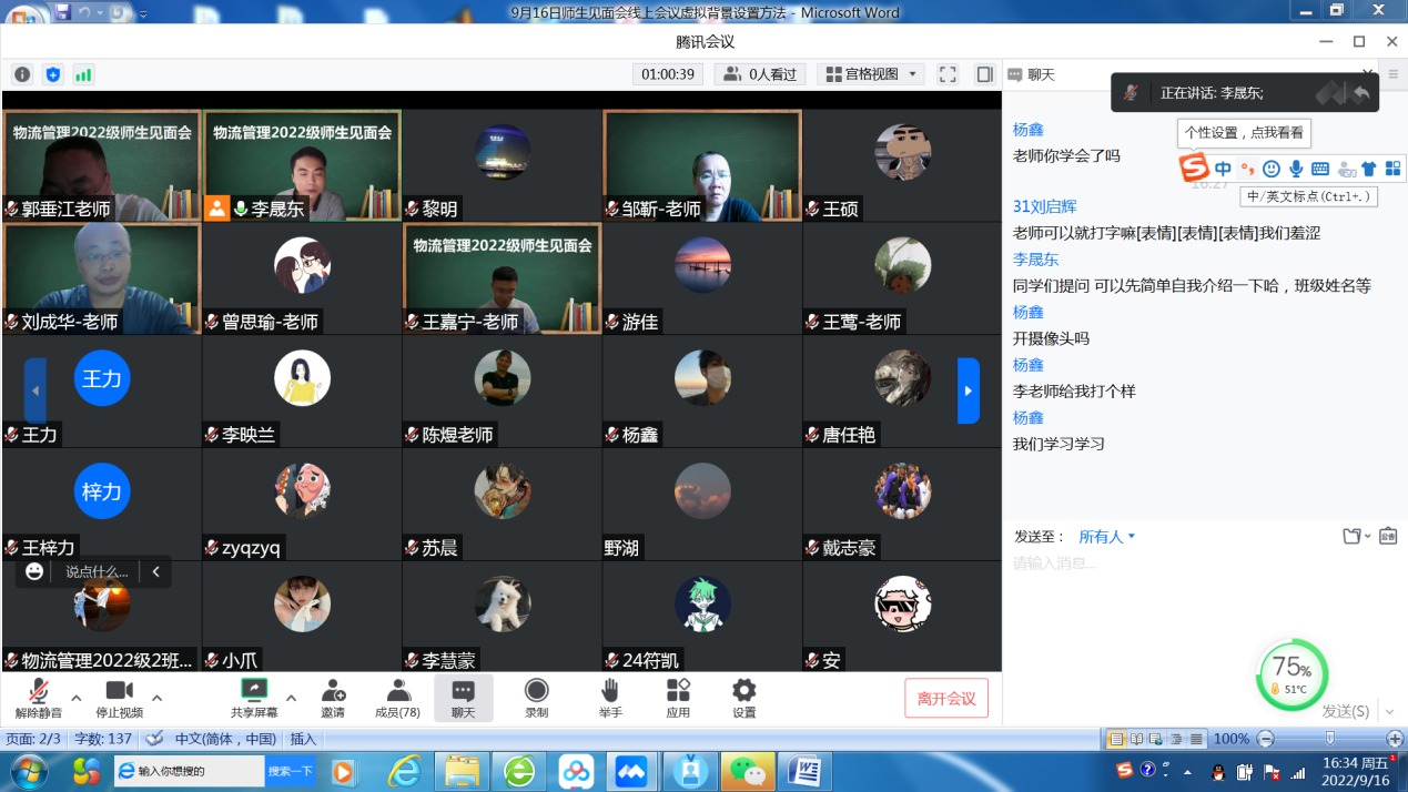 2022年9月16日下午2:00,物流管理与工程系组织2022级物流管理专业新生和系全体教师召开了师生见面会,师生相聚云端首次见面。